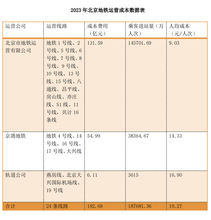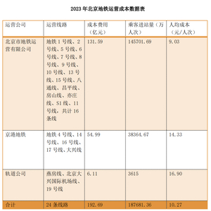“2023年,北京24条地铁线平均运营成本达10.27元/人次,比2022年的14.31元/人次降低28.23%,但仍远高于2019年的7.82元/人次。”