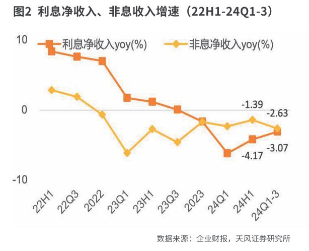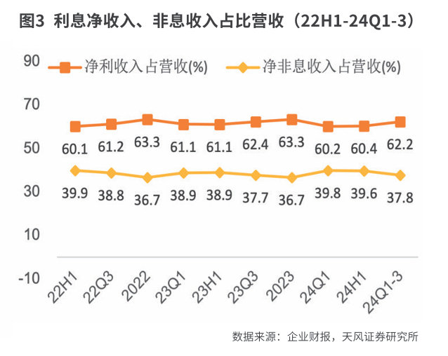 具体拆分来看,净利息收入同比回落3.07%(2024年上半年为-4.2%),净利息收入较上半年有所改善;非息收入同比回落2.6%,降幅较上半年走阔1.2个百分点,主要是受部分产品降费叠加客户投资意愿偏弱的影响,其中,中间业务收入同比降幅收窄1.7个百分点至负增长16.9%,其中,财富管理手续费及佣金收入同比降幅较上半年收窄4.9个百分点至负增长27.6%,边际同步改善。