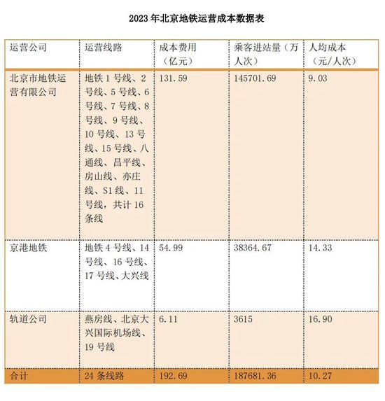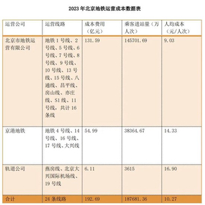“2023年,北京24条地铁线平均运营成本达10.27元/人次,比2022年的14.31元/人次降低28.23%,但仍远高于2019年的7.82元/人次。”