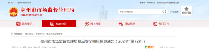 安徽省亳州市市场监督管理局食品安全抽检信息通告(2024年第72期)