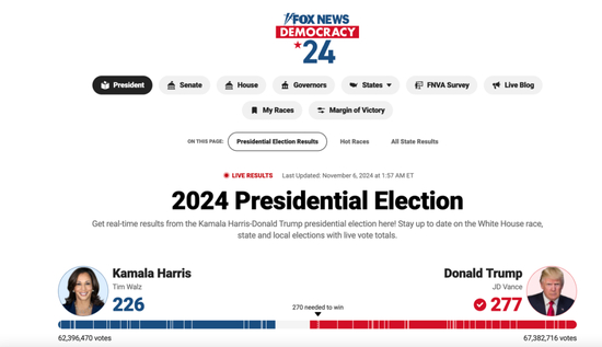 首先是,特朗普碾压式赢了哈里斯,无论是选举人票还是普票都优势明显,预测最终将以277:226获胜。