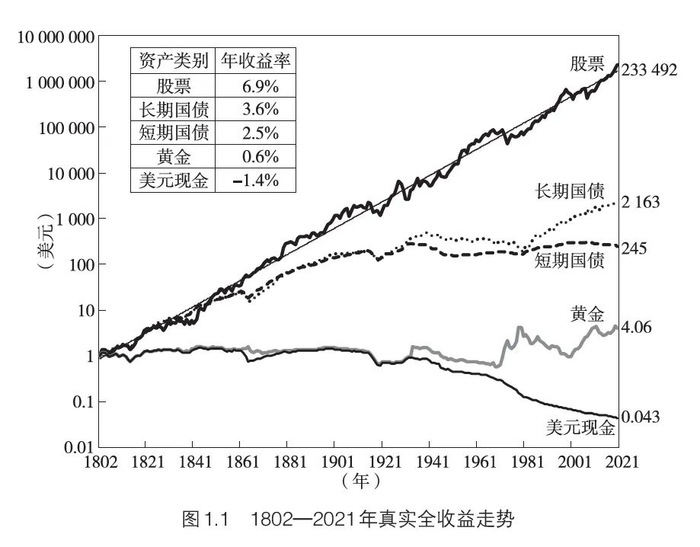 在最新的第6版中,作者统计了美股1802—2021年五种不同类型的资产剔除通货膨胀之后的真实收益情况,分别是股票资产、长期国债、短期国债、黄金和美元现金。