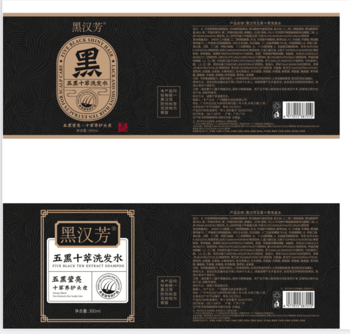 记者查看“黑汉芳五黑十萃洗发水”产品详情,发现该网店提供的信息很少,只标称生产企业为“广州蕴美化妆品有限公司”,品牌为“黑汉芳”,产品规格为300ml,产地广东,成分为“草本成分:黑灵芝、黑芝麻、黑柳树、黑孢块菌、何首乌”。记者注意到,该产品所标称的功效仅为“让秀发更加靓丽顺滑”。