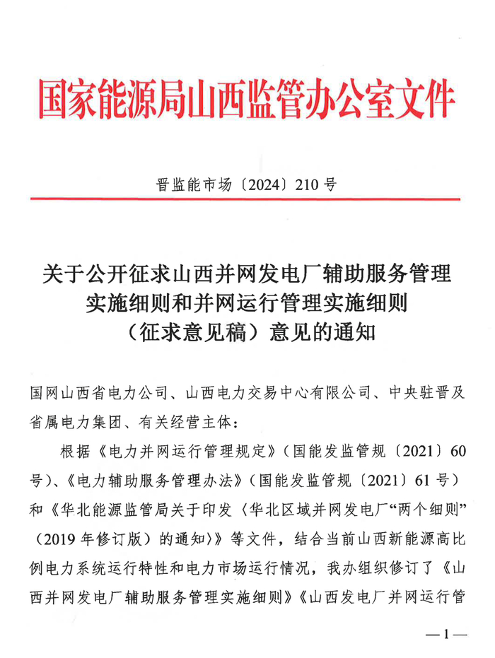 储能与电力市场获悉,近日,山西能监办发布《关于公开征求山西并网发电厂辅助服务管理实施细则和并网运行管理实施细则征求意见稿)意见的通知》,随通知发布5份辅助服务市场实施细则: