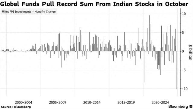 2000年至2024年10月,外国资产组合净投资(FPI)在印度股市的动向 彭博社