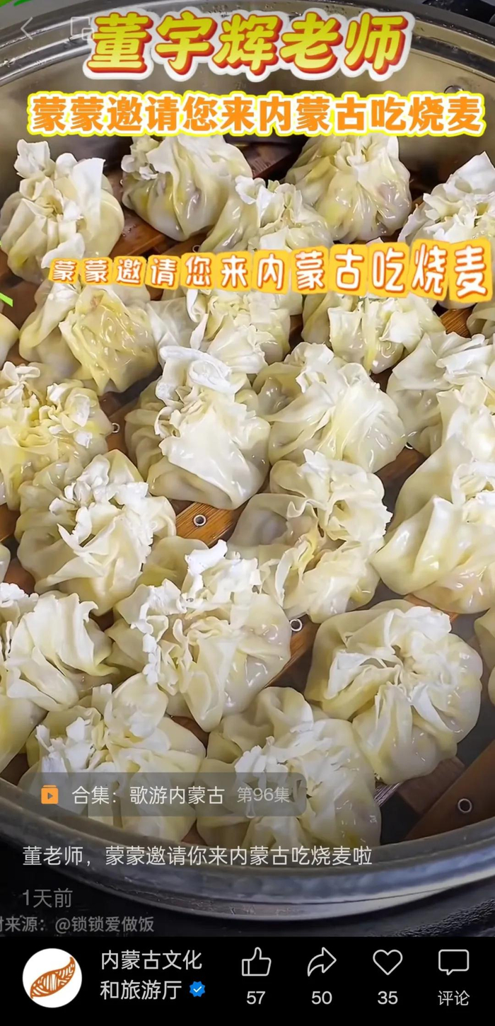昨晚(6日),内蒙古文旅厅也发布视频喊话董宇辉,称“蒙蒙邀请您来内蒙古吃烧卖。西北以羊肉烧卖为主,尤其内蒙古呼和浩特的最出名,烧卖起源于呼和浩特,原是茶馆里配砖茶卖的羊肉馅点心。内蒙古的烧卖可有讲究,一是制作需16道复杂工序,二是按皮的净重论‘两’卖,有‘二两烧卖撑死汉’之说,三是承载情感,是内蒙古人的家乡味、游子的乡愁。”