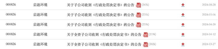 值得注意的是,因环保排污问题,启迪环境近年来屡被处罚。仅2024年,启迪环境已连发多次关于其全资子公司、子公司收到《行政处罚决定书》的公告。