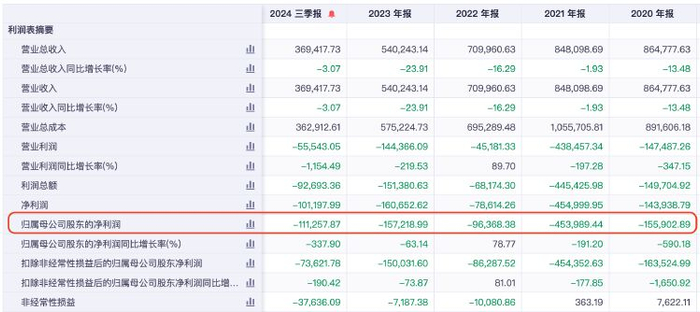 事实上,公司自2020年以来,处于连续亏损状态,2020年~2023年归母净利润分别为-15.59亿元、-45.40亿元、-9.64亿元、-15.72亿元。