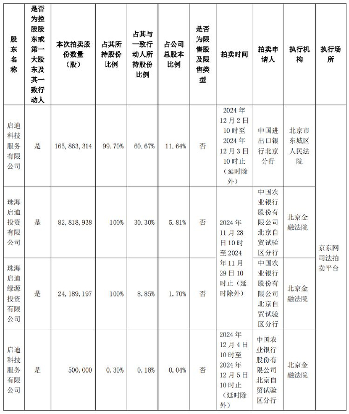 据公司此前披露,启迪科服及其一致行动人珠海启迪投资有限公司(简称“珠海启迪”)、珠海启迪绿源投资有限公司(简称“启迪绿源”)合计持有的公司2.73亿股股份拟被司法拍卖,前述被拍卖股份占其持有公司股份总数的99.82%,占公司总股本的19.15%。