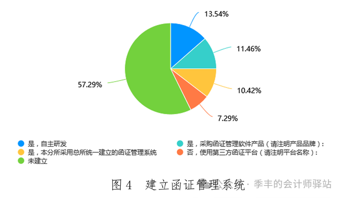 其中,自主研发占比为13.54%;采购函证管理软件产品的占比为11.46%;采用总所统一建立的函证管理系统的占比为10.42%;未建立函证管理系统,使用第三方函证平台的占比为7.29%;从未建立函证管理系统的占比为57.29%。如图4 所示: