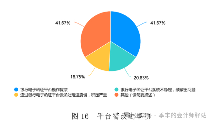 其中,银行电子函证平台操作复杂占比41.67%,电子函证平台系统不稳定,频繁出问题占比20.83%,通过银行电子函证平台发函处理速度慢,积压严重占比18.75%,其他原因占比41.67%。如图16所示: