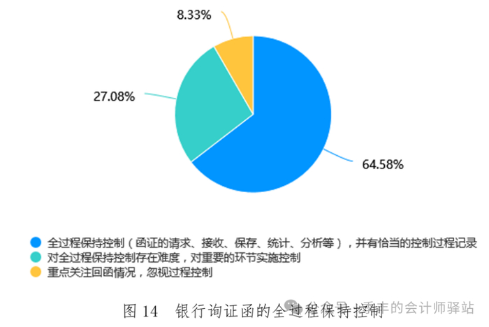 其中,全过程保持控制占比64.58%;对全过程保持控制存在难度,对重要环节实施控制占比27.08%;重点关注回函情况,忽视过程控制占比8.33%。如图14所示:
