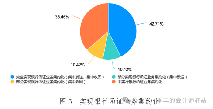 其中,完全实现了集约化(集中发送、集中收回)占比为42.71%;部分实现银行函证集约化20.84%(仅集中发送或仅集中收回);未实行银行函证业务集约化的占比为36.46%。如图5所示: