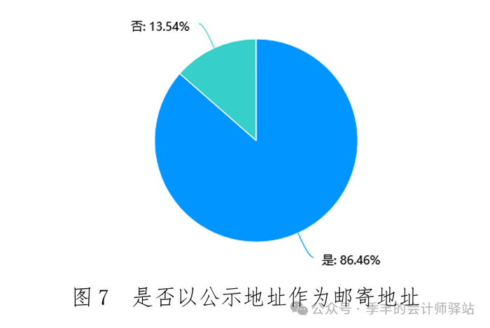 其中,采用平台公示地址作为银行询证函的邮寄地址的占比为86.46%;未采用公示地址作为邮寄地址的占比为13.54%。如图7所示: