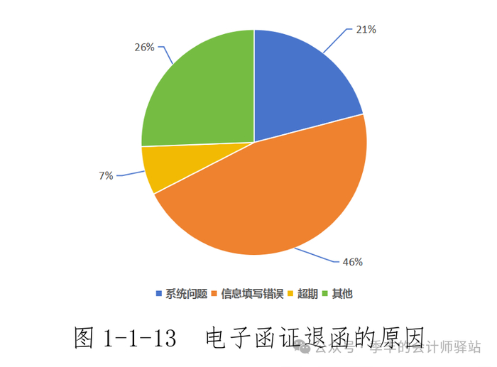 其中,系统问题占比21%;信息填写错误占比46%;超期占比7%;其他原因占比26%。如图13所示:
