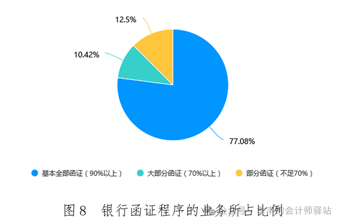 其中,基本全部函证(90%以上)占比77.08%;大部分函证( 70%以上)占比10.42%;部分函证(不足70%)占比12.5%。如图8所示: