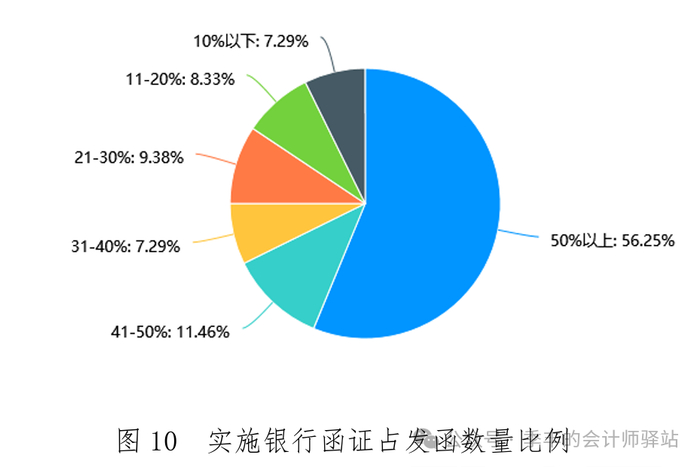 10.2024 年 1-4 月,实施银行函证占发函数量比例 其中,50%以上的占比56.25%;41-50%的占比11.46%;31-40%的占比7.29%;21-30%的占比9.38%;11-20%的占比8.33%;10%以下的占比7.29%。如图10所示: