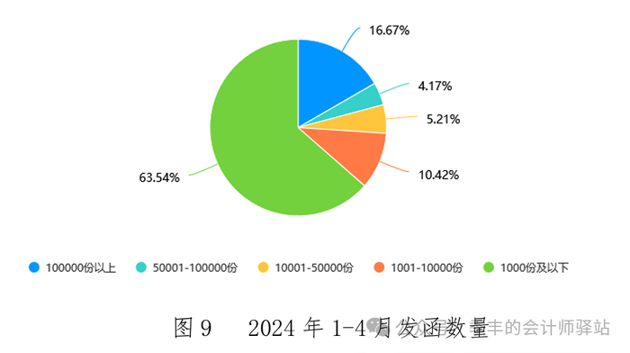 其中,100000份以上占比16.67%;50001-100000份占比4.17%;10001-50000 份占比5.21%;1001-10000 份占比10.42%;1000 份及以下占比63.54%。如图9所示: