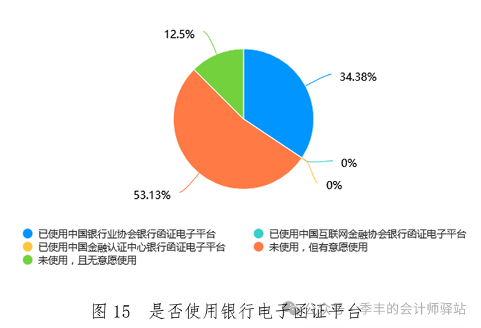 其中,使用中国银行业协会银行函证电子平台占比34.38%;使用中国互联网金融协会银行函证电子平台占比0%;使用中国金融认证中心银行函证电子平台占比0%;未使用但有意愿使用占比53.13%;未使用且无意愿使用占比12.5%。如图15所示: