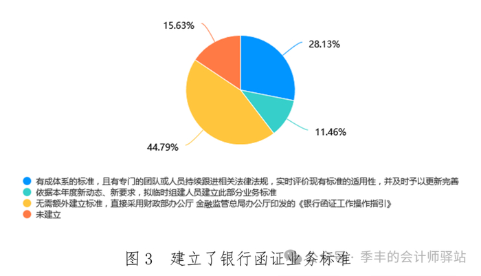 其中有成体系的标准,且有专门的团队或人员持续跟进相关法律法规,实时评价现有标准的适用性,并及时予以更新完善的占比为28.13%;依据本年度新动态、新要求,临时组建人员建立此部分业务标准的占比为11.46%;无需额外建立标准,直接采用财政部办公厅、金融监管总局办公厅印发的《银行函证工作操作指引》的占比为44.79%;未建立业务标准的占比为15.63%。如图3所示: