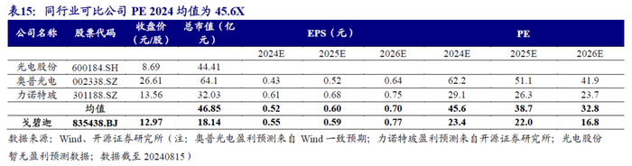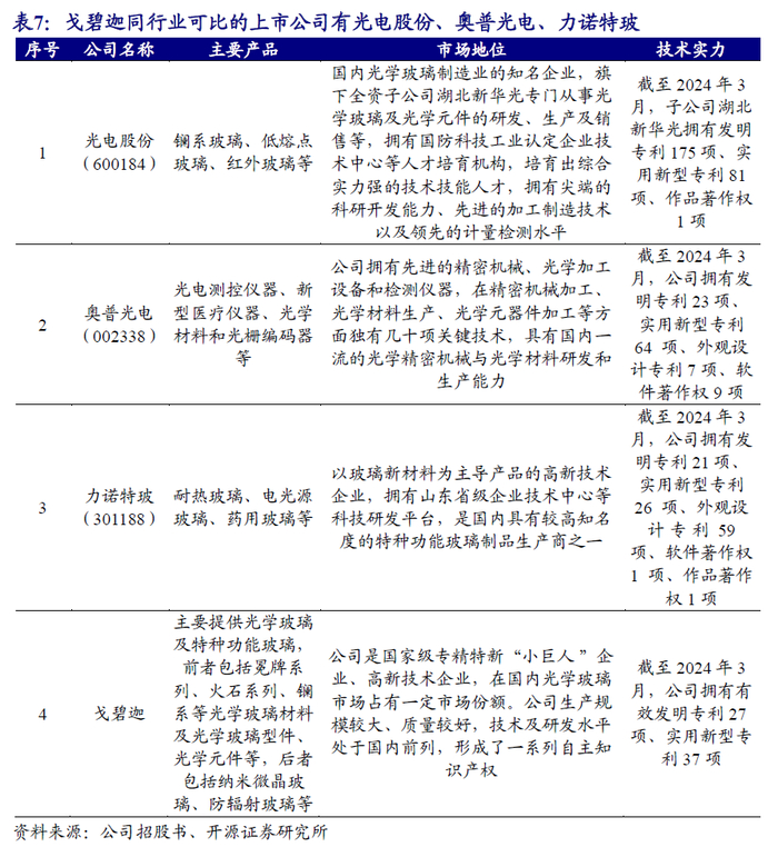 戈碧迦是一家光学玻璃和特种功能玻璃行业的生产厂商,在该领域内尚无完全可比上市公司。综合考虑符合同行业可比公司有光电股份、奥普光电、力诺特玻。