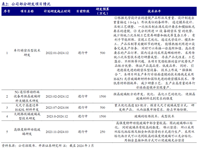 公司仍在加大研发投入,研发费用整体呈现增长态势。2020-2023年研发费用率分别为5.67%、5.94%、4.66%、4.82%。2023年公司研发费用为 3,892.89 万元,与同比增加 94.66%。公司在新产品配方、特种功能玻璃工艺及窑炉创新设计、先进检验检测设备等方面持续投入,开展研发项目 12 项。2024H1,公司研发费用为 2604.19 万元,同比增加 67.09%。公司研发能力建设重点突出在光学玻璃和特种功能玻璃的配方开发、全产业链专利布局、工艺优化、窑炉创新设计、先进检验检测设备购置、高端研发人才引进、研发体系建设等方面的持续投入。
