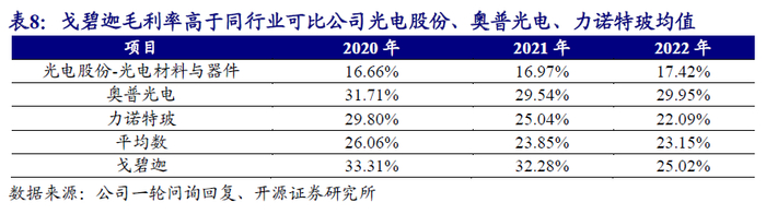 2020-2023年公司销售毛利率分别为 33.31%、32.28%、25.02%和 29.82%,略高于同行业可比公司平均水平。由于产品结构、下游客户及应用领域、单位生产成本、生产方式、对外购型件的会计处理方式等方面存在一定的差异,戈碧迦毛利率高于同行业可比公司光电股份、奥普光电、力诺特玻均值。