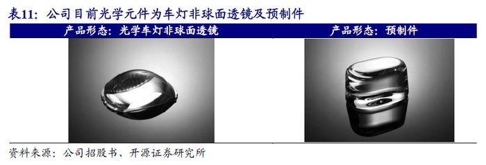 公司目前光学元件为车灯非球面透镜及预制件。公司以光学玻璃材料配方为基础,通过特定工艺及配方一次滴料成型为车灯预制件,并通过精密模压制成车灯非球面透镜。该产品相对于高硼硅材料制成的车灯透镜具有高折射率、高透过率等性能,使车灯光线射程远、亮度均匀、清晰度高,提高了驾驶安全。