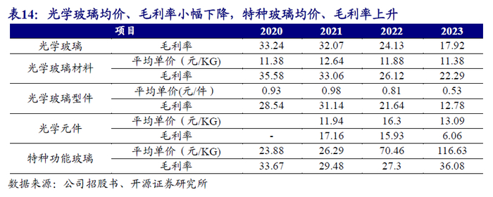 单价&毛利端:光学玻璃均价、毛利率小幅下降,特种玻璃均价、毛利率上升。
