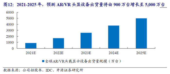 目前常规的VR/AR设备由头戴式显示设备(HMD)、主机系统、追踪系统、控制器等组成。头戴式显示设备的主要视觉感知硬件是由光学玻璃材料制成的摄像头,可实现拍照、位置感知与追踪、环境映射等功能。根据IDC预测数据,AR/VR头显设备出货量在2021年至2025年间将以53.53%的年复合增长率增长,由2021年的900万台增长至2025年的5,000万台,其中,VR、AR头显出货量在2021年和2025年分别为800万台和100万台、2,900万台和2,100万台。AR/VR市场需求的增长,将为光学元器件提供广阔的市场空间