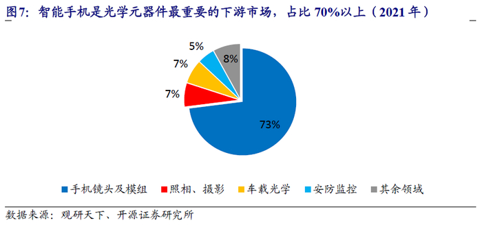 光学玻璃下游应用市场中,智能手机是光学元器件最重要的下游市场,占比70%以上,数码相机、摄像机等传统光学行业份额占比约为7%。智能手机市场日益饱和,需求增速放缓。近年来,随着信息化、数字化进程的加快,安防监控、智能驾驶、运动DV、无人机、激光投影、AR/VR等新兴技术兴起,光学玻璃下游需求呈持续增长态势。总的来看,光学玻璃行业发展前景广阔。