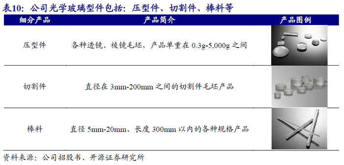 光学玻璃型件是指将光学玻璃材料经过压型、切割等工序,加工而成的各类光学毛坯。光学玻璃型件制造是连接光学玻璃材料和光学元件的重要加工环节,光学玻璃型件通过下游光学元件厂加工成各类光学成像镜片,提供给镜头厂商组装成镜头。公司为加强与光学镜头厂商的合作,带动光学玻璃材料的销售,目前通过销售光学玻璃型件已与下游客户如舜宇光学、凤凰光学等知名光学厂商达成合作。公司光学玻璃型件包括:压型件、切割件、棒料等。