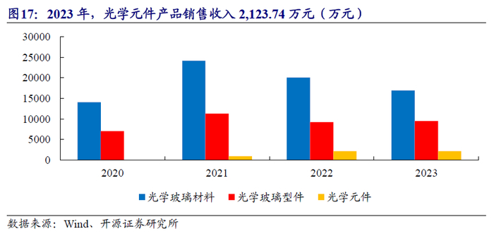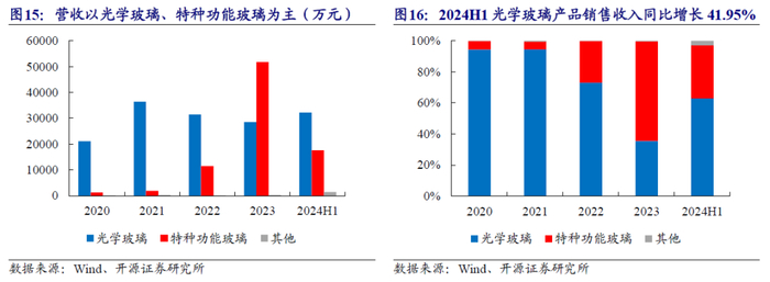 公司产品收入结构侧重点发生了变化。2020-2022年公司产品以光学玻璃为主,2021 年度该产品收入占营业收入比例达到 94.56%,特种功能玻璃收入占比仅为4.93%,2023 年,光学玻璃产品收入占比下降到 35.35%,特种功能玻璃收入占比上升到 64.00%。