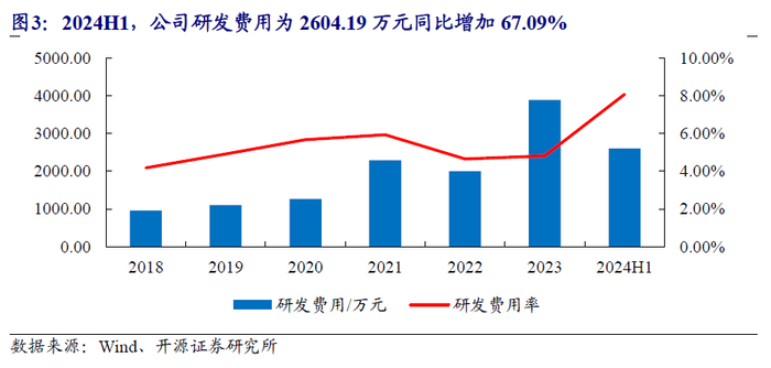 截至2024H1,公司研发人员共 123 人,开展研发项目 15 项,公司及子公司累计取得 72 项有效专利,其中发明专利 33 项,实用新型专利 39 项,2024H1新增 6 项发明专利。公司持续深化产学研合作,与陕西科技大学、中国科学院西安光学精密机械研究所及湖北省企校联合创新中心等国内科研院所及高校建立产学研合作关系,提高了项目研发效率和科技成果转化率。