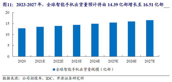 自2010年以来,智能手机在全球范围内快速普及。手机摄像模块与生物识别模块是智能手机的核心光学元件。随着智能手机的镜头由前后双摄、后置二摄向三摄、四摄等多摄方向发展,镜头材料从光学塑料逐步向玻塑混合方向发展,光学元件的市场需求进一步扩大。根据IDC数据,全球智能手机出货量,在2020年达到12.82亿部,2023-2027年,全球智能手机出货量规模预计将由14.39亿部,以3.5%年均复合增长率增长至2027年的16.51亿部。根据市场调研机构Counterpoint统计,2020年平均每部智能手机镜头数量都在3.7个以上,其中四颗及以上摄像头的手机占智能手机市场的29%。预计到2023年,多后置摄像头的手机比例将达到90%以上。目前手机镜头以塑料镜片为主,随着智能手机对高像素变焦等拍摄功能需求升级及光学性能提升,预计玻璃镜头出货占比将持续提升,手机应用端的光学玻璃材料市场规模具有较大增长空间。
