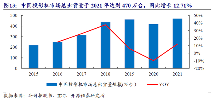 光学玻璃是投影镜头的主要原材料,光学玻璃的折射率、透光率直接影响投影设备的清晰度,因此下游投影行业的发展将直接带动光学玻璃产业在质量和数量上的提升。根据IDC数据显示,2015年至2019年,中国投影机市场总出货量由219万台增长至462万台,年均复合增长率达到20.57%,快速增长趋势明显。中国投影机市场总出货量于2021年达到470万台,同比增长12.71%。投影机市场规模较大且需求稳定,为光学镜头市场的稳健发展提供了规模基础,进而推动光学玻璃制造业的发展。