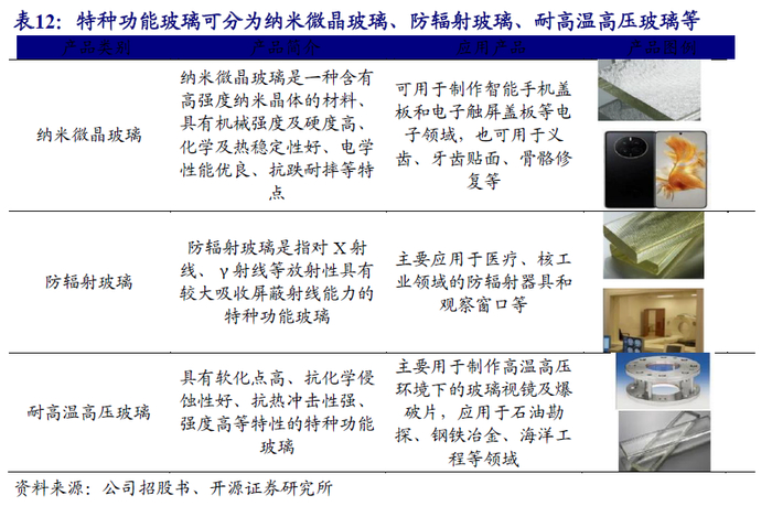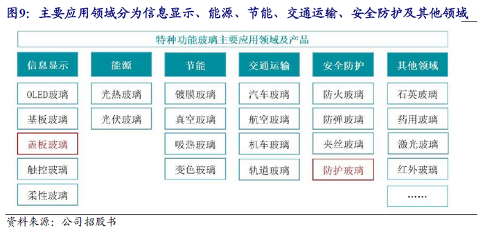 特种功能玻璃的主要应用领域可分为信息显示、能源、节能、交通运输、安全防护及其他领域,每一应用领域中可再细分出不同类别的玻璃产品。在公司特种功能玻璃产品中,纳米微晶玻璃用于具备高强度抗跌耐摔的优异性能,主要应用于智能手机、电子触屏盖板等消费电子领域;防辐射玻璃主要应用于医疗、核工业领域的防辐射器具和观察窗口;耐高温高压玻璃主要用于制作高温高压环境下的玻璃视镜及爆破片,应用于石油勘探、钢铁冶金、海洋工程等领域。
