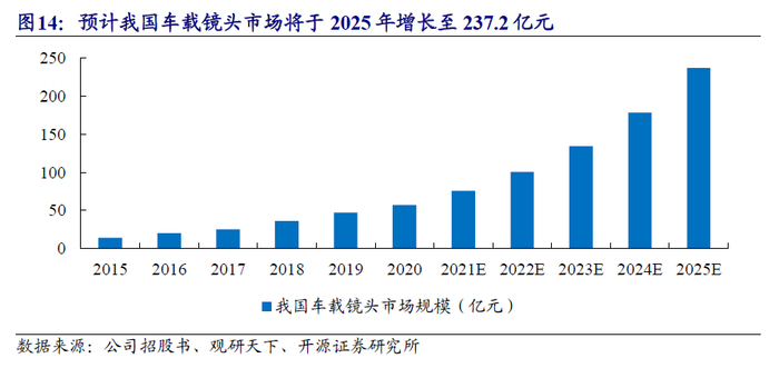 随着ADAS、智能驾驶等新兴技术的普及与应用,对车载镜头成像需求不断提升,市场渗透率不断提高。通常,一套完整的ADAS系统需包括6个摄像头,智能驾驶汽车的摄像头数量可达到8个甚至更多。我国车载镜头市场规模从2015年的14亿元以32.42%的年均复合增长率增长至2020年57亿元,实现高速增长,预计我国车载镜头市场将以33%的年均复合增长,于2025年增长至237.2亿元。我国车载镜头市场将蓬勃发展,并带动上游光学元器件行业及光学玻璃制造业逐渐向高端化发展。