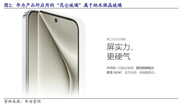 纳米微晶玻璃中有近 90%是微晶,当受到外力冲击时,微晶体可以阻碍或者停止裂纹的扩展,使面板不易破损。纳米微晶玻璃在生产过程中保留了玻璃非晶体的结构特性,通过控制晶体大小和数量,大幅提高结构强度及透光性,抗摔性能相对传统玻璃有成倍提升,纳米微晶玻璃代表着 5G 时代消费电子盖板玻璃的发展方向。2020 年 10 月苹果发布的 iPhone12 所应用的“超瓷晶面板”,可以承受从两米高度跌落到粗糙表面的测试,抗划伤性能是第六代“Gorilla”玻璃产品的两倍,2022 年9 月华为发布的 Mate50 系列所应用的“昆仑玻璃”,都是属于纳米微晶玻璃。