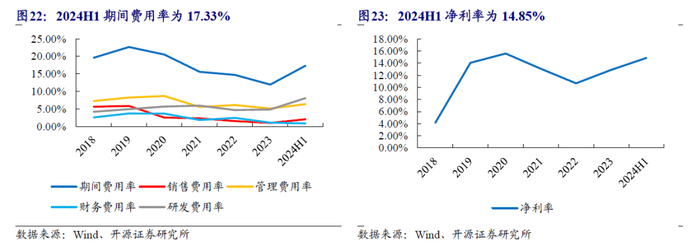 净利率受毛利率及期间费用率的综合影响,净利率整体有所波动,净利率呈现先减后增趋势, 2024H1净利率为14.85%。