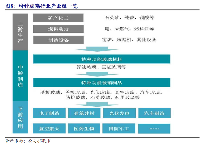 特种功能玻璃是能源化工、医疗医药、航空航天、钢铁冶金、海洋工程、核工业等领域中不可或缺的关键材料,是高端制造业升级和国防工业建设的重要保障。随着新一代信息技术、新能源、节能环保、航空航天等领域的高速发展,特种功能玻璃的需求量增加,性能要求不断提高。特种功能玻璃制造位于产业链的中间环节,其上游行业与光学玻璃大致相同,原材料主要包括石英砂、碳酸锂、氧化铝、氧化锆等,主要能源为电力、天然气等,主要设备包括窑炉、压延机、混料机等。中游制造按生产流程分为特种功能玻璃材料生产与特种功能玻璃制品生产。主要应用领域可分为信息显示、能源、节能、交通运输、安全防护及其他领域。