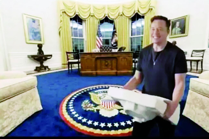 选举结束后,马斯克在X平台上发了一张他自己“在总统办公室抱着水槽”的梗图,并配文称“让它沉入(Sink有水槽和下沉的双重意思)其中”,大有暗示从政之意。2022年,马斯克接管推特的时候承诺要进行裁员,还抱着水槽进入了推特大楼。