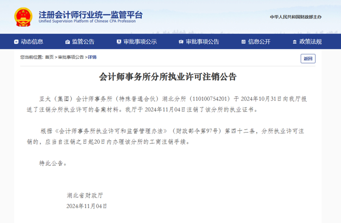 亚太(集团)会计师事务所(特殊普通合伙)湖北分所(110100754201)于 2024年10月31日向我厅报送了注销分所执业许可的备案材料。我厅于 2024年11月04日注销了该分所的执业证书。