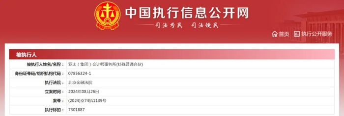1亚太(集团)会计师事务所(特殊普通合伙)2024年8月26日(2024)京74执1139号查看