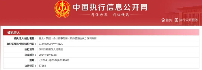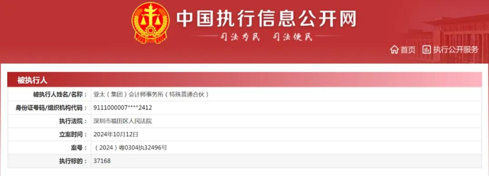 被执行人姓名/名称:亚太(集团)会计师事务所(特殊普通合伙)