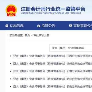 亚太(集团)会计师事务所(特殊普通合伙)云南分所(执业证书编号:110100755301),因注册会计师人数不符合分所执业许可条件且未在规定时限内整改,我厅于2024年10月30日撤销了该所执业许可并办理了注销手续。自2024年10月30日起,亚太(集团)会计师事务所(特殊普通合伙)云南分所不得以会计师事务所名义开展业务,不得从事注册会计师法定业务。