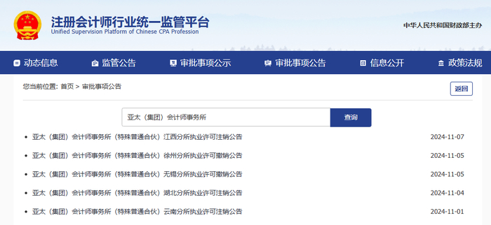 亚太(集团)会计师事务所(特殊普通合伙)江西分所(110100753601)于 2024年11月06日向我厅报送了注销分所执业许可的备案材料。我厅于 2024年11月07日注销了该分所的执业证书。