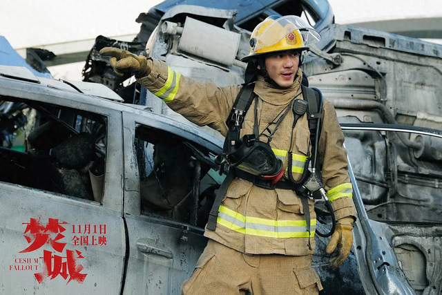 演员白宇在电影《焚城》中饰消防队长黎杰峰