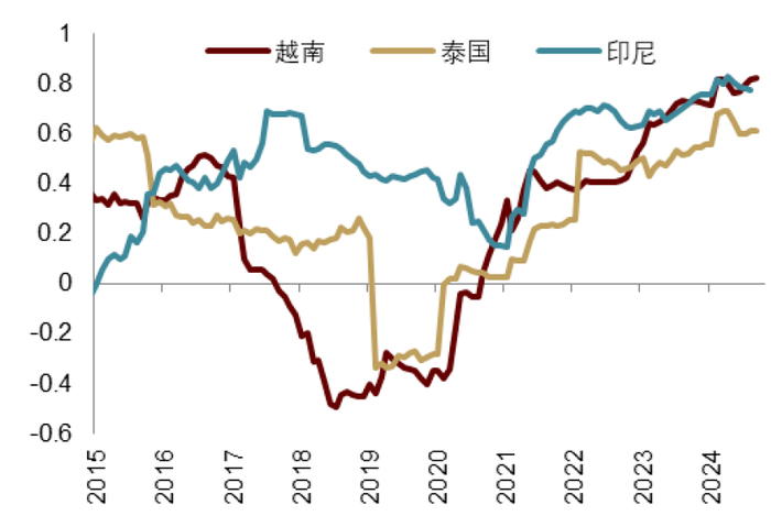 注:纵轴为越南、泰国和印尼从中国进口增速与对美出口增速的相关系数资料来源:Wind,中金公司研究部