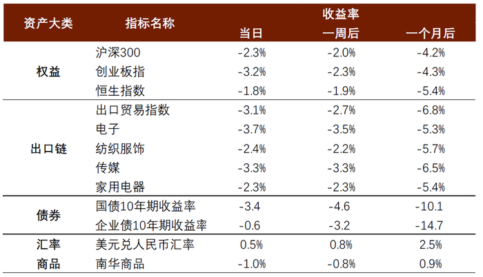 但未来,如果特朗普高额关税落地,对国内经济和市场带来的不确定性将上升,国内资产表现取决于政策力度和基本面修复情况。参考特朗普上一任期,在2018年和2019年与我国有三轮贸易摩擦,分别对应 500 亿美元、 2000 亿美元和3000 亿美元关税清单。贸易摩擦对权益市场和出口带来了阶段性压力。2018年,沪深300出现阶段性回撤(图表9),同时美国营收占比较高的电子、纺织服装、传媒和家用电器板块均走弱(图表10)。随后,2019年下半年,出口同比增速回落,其中对美国出口较多的机电、音响设备和零件,杂项制品和纺织制品出口增速回落较大(图表11)。在三轮贸易摩擦重要时间节点当天、一周后和一个月后,国内主要风险资产表现不佳,出口链相关板块下跌更多;人民币兑美元汇率贬值;债券类资产表现较好,利率债和信用债利率均下行(图表12)。